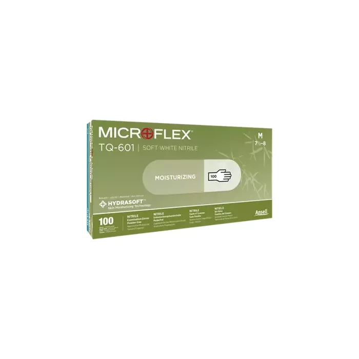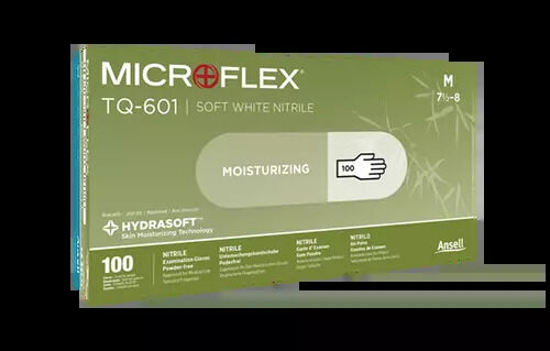 ® TQ-601 Soft White Nitrile examination gloves comfortably protect hands while replenishing moisture and preventing dryness. The patented HYDRASOFT™ Skin Moisturizing Technology is proven to allow skin to retain 2X more moisture* than gloves without HYDRASOFT™. The super soft, lightweight nitrile construction provides extra comfort and tactility while working.