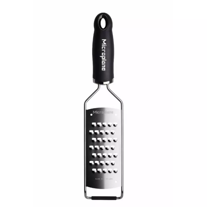 The Microplane Gourmet Series has an expansive paddle with ample grating surfaces and US-made stainless steel blades. Ultra-sharp photo-etched teeth make fast work out of grating potatoes, carrots, onions, and cheeses. The Stainless steel frame provides extraordinary durability. The soft-touch handle matches back to the premium classic series zesters. The non-skid foot adds stability when grating on counters and plates.