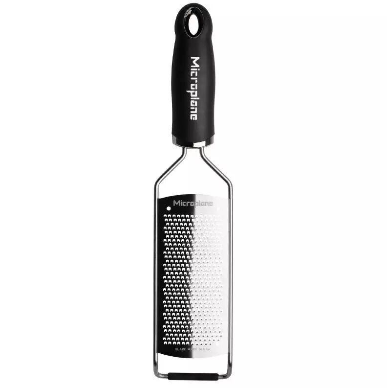 has an expansive paddle with ample grating surfaces and US-made stainless steel blades. Ultra-sharp photo-etched teeth make fast work out of grating potatoes, carrots, onions, and cheeses. The Stainless steel frame provides extraordinary durability. The soft-touch handle matches back to the premium classic series zesters. The non-skid foot adds stability when grating on counters and plates.