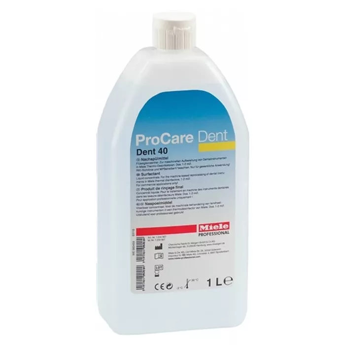 Miele ProCare Dental 40 is a specialized liquid rinse aid designed for commercial use in dental and medical environments. This 1-liter bottle ensures thorough and efficient rinsing of instruments, leaving them spotless and free of water spots and residues. ProCare Dental 40, which is designed to work seamlessly with Miele washer-disinfectors, improves the drying process, ensuring that instruments are ready for immediate use or further processing.
