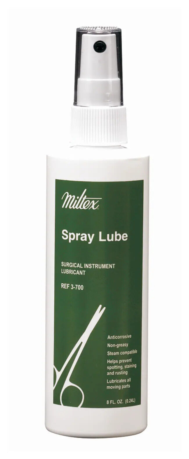 MILTEX Spray Lube, 8 oz. (0.24 liter) bottles (case of 12). Pre-mixed, non-silicone, anti-corrosive formula in a ready to use 8 oz. spray pump bottle. Steam permeable and water soluble. Helps prevent spotting, staining and rusting. Lubricates instrument box locks, screw locks, scissors blades, and any other metal to metal moving parts.