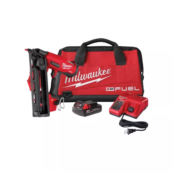 - Includes: M18 Fuel™ 16 Gauge angled finish nailer, M18™ Redlithium™ CP2.0 battery, M18™ & M12™ Multi-voltage charger, Contractor bag