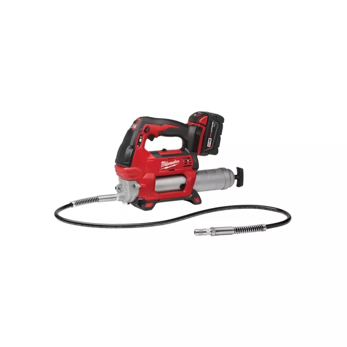 - Includes: (1) M18™ cordless 2-speed grease gun, (1) 48" flex hose w/ spring guard, (1) M18™ compact REDLITHIUM™ battery, (1) M18™ & M12™ multi-voltage charger, (1) high pressure grease coupler, (1) carrying case, (1) shoulder strap