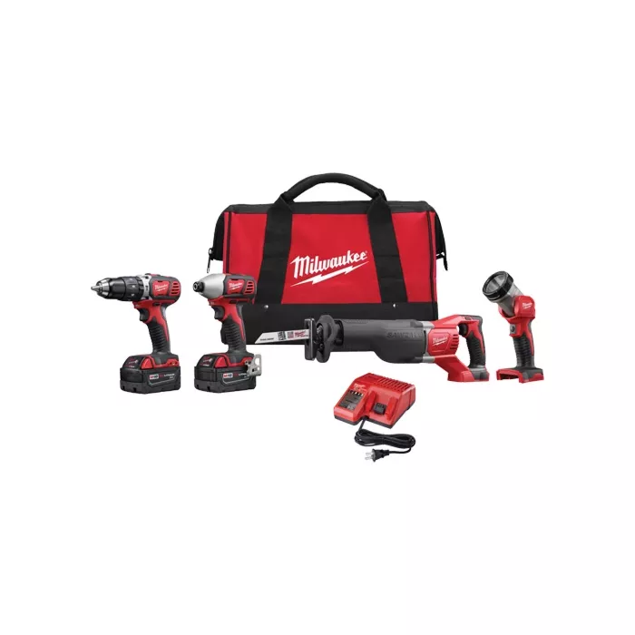 - Includes: Contractor bag, M18™ Compact 1/2" hammer drill/driver, M18™ Sawzall® Reciprocating Saw, M18™ 1/4" Hex Impact Driver, M18™ Work Light, M18™ Redlithium™ XC Extended Capacity Battery, & M18™ & M12™ Multi-Voltage Charger