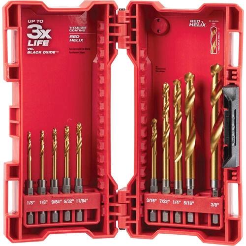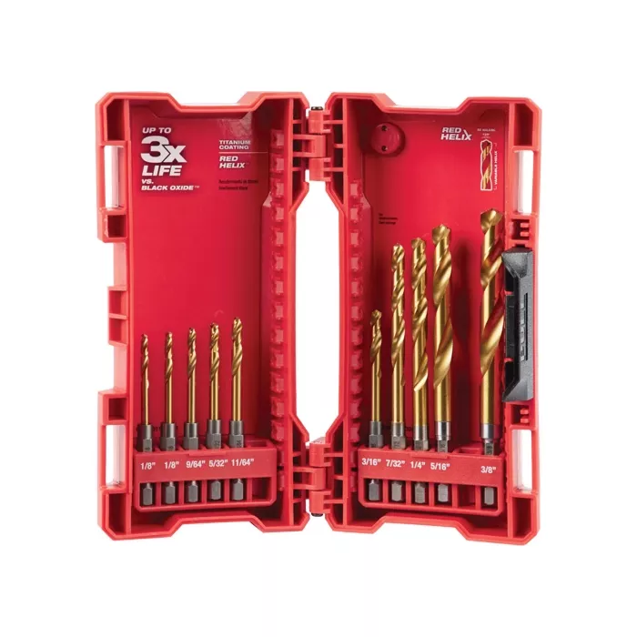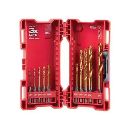 - Includes: (2) 1/8" Titanium Shockwave™ drill bits, (1) 9/64" Titanium Shockwave™ drill bit, (1) 5/32" Titanium Shockwave™ drill bit, (1) 11/64" Titanium Shockwave™ drill bit, (1) 3/16" Titanium Shockwave™ drill bit, (1) 7/32" Titanium Shockwave™ drill bit, (1) 1/4" Titanium Shockwave™ drill bit, (1) 5/16" Titanium Shockwave™ drill bit, (1) 3/8" Titanium Shockwave™ drill bit