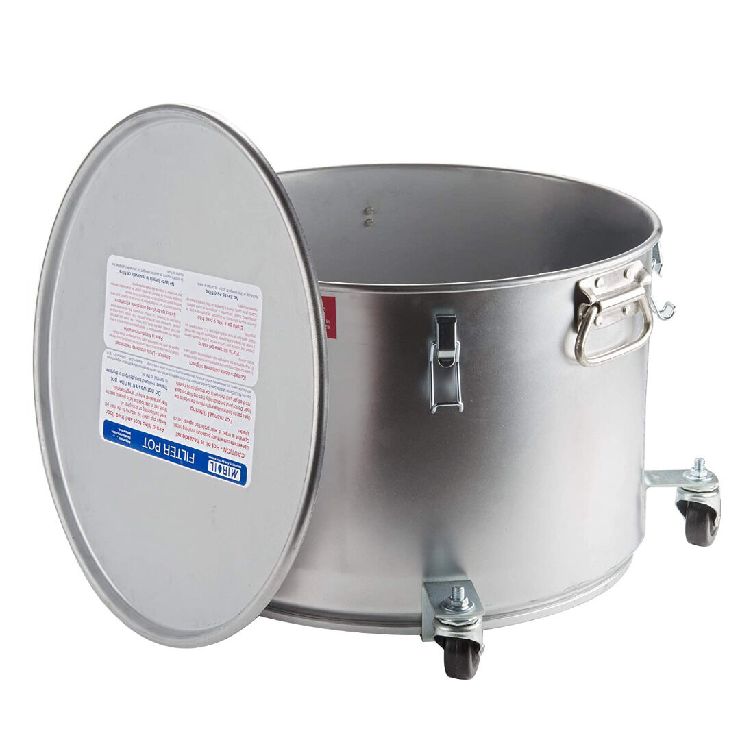 filter pot features stainless steel construction and is designed for the safe filtering and handling of hot grease and oil. It has a low profile that fits under drain valves and includes a caster base for easy transport. Low Profile Includes Mobility Base and Lid B6PS Bag and Frame Assembly Sold Separately.