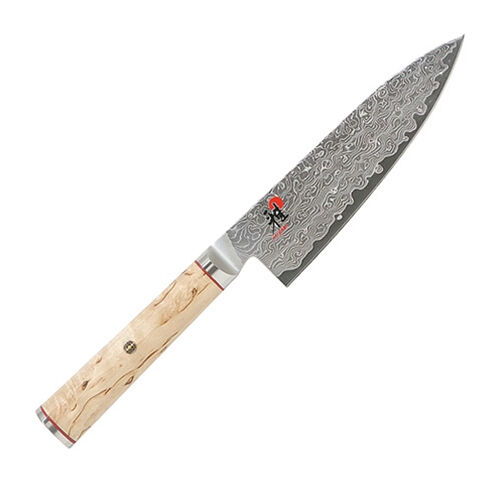 The heft, weight and balance of this knife allow it to be used for both heavy duty work with thicker cuts of vegetables, fruits and meats or mincing and chopping herbs. The curved blade enables a rocking cut and wide surface enables knuckle clearance and gathering of cut materials. Micro-Carbide MC63 powdered steel core and CRYODUR® vacuum tempered blade. Three-step Honbazuke honing process. 100 layers of stainless steel (50 layers per side) wrap the blade core and are polished to reveal a one-of-a-kind flower Damascus pattern. 63° Rockwell Hardness. Edge Angle: 9.5-12° per side. Traditional Japanese D-shape Birchwood handle enhanced with a mosaic pin and a metal end cap featuring the MIYABI logo. Made in Seki, Japan. Size: 6"/160 mm.