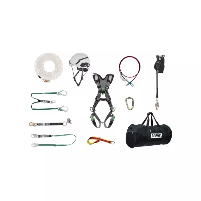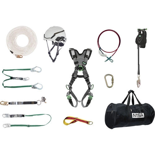 - Includes: V-Fit™ Large/Medium Full Body Harness, V-Gard® H1 Safety Helmet with Fas-Trac® III Pivot Ratchet Suspension, V-Series 6' Double-Leg Shock-Absorbing Lanyard with Snap Hooks, V-Series 6' Single-Leg Shock-Absorbing Lanyard with Snap Hooks, V-Edge™ 8' Swiveling Web Personal Fall Limiter for Leading Edge, Rope Grab Fall Arrester, 100' Synthetic Rope Lifeline, Auto-Locking Steel Carabiner, 4' Double D-Ring Anchorage Connector Strap, 6' Anchorage Cable Sling, Roofer Kit Tote Bag