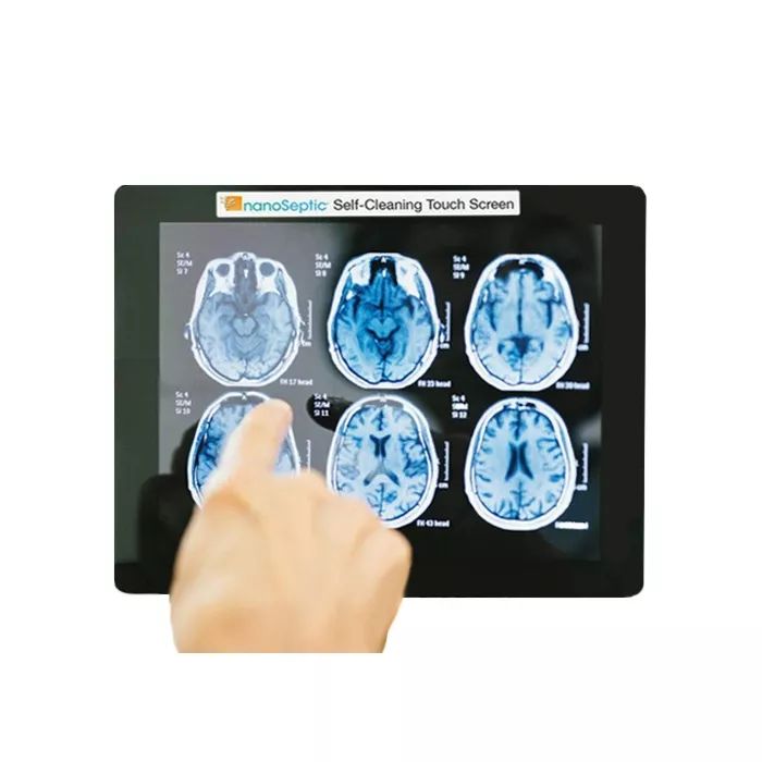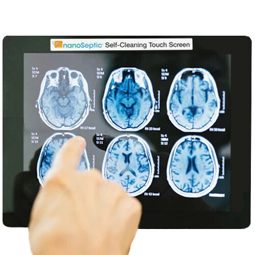 From restaurant checkout to hospital and airline kiosks, this NanoSeptic film turns any touchscreen into a continuously self-cleaning surface. Low tack adhesive provides a more secure installation than traditional static cling. Can be cut to fit any size screen. The touchscreen shown has a label identifying the screen as a NanoSeptic surface. This label is included in all clear film orders.