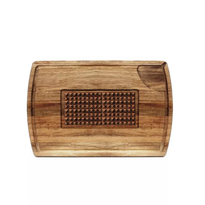 Multi-Function Carving Board, with center meat grip, 12 x 18" / 30 x 45cm, acacia. Designed for carving and serving good-sized roasts. Holds meat in place with a grid of cut pyramids. Grooved perimeter collects flavorful juices. Reverse side is perfectl y flat for slicing or serving and equipped with a slotted area to hold tablets. Resists water penetration and will not absorb stains or odours.