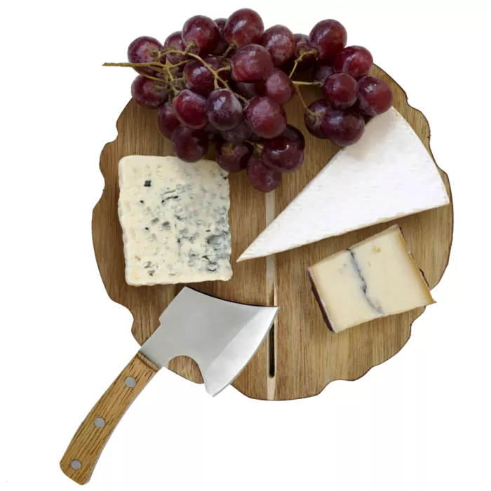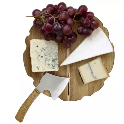 Cheese Board & Chopper, 8.5" / 22cm dia, acacia and stainless steel. Ideal to serve cheese, fruits and other accoutrements. Made of acacia wood, a sustainable, richly grained wood prized for its density, hardness and uniquely patterned glow.