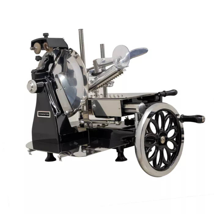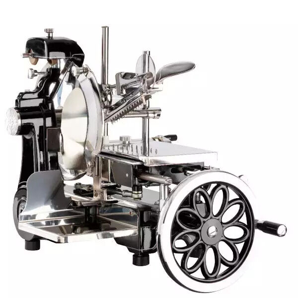 Bring a touch of elegance and nostalgia to your culinary setup with the Nella 12" Volano Manual Meat Slicer, featuring a distinctive black color with a luxurious flower flywheel. This slicer combines timeless design with modern functionality, making it a standout addition to any restaurant, deli, or gourmet shop, particularly those specializing in finely sliced prosciutto and other delicate meats.