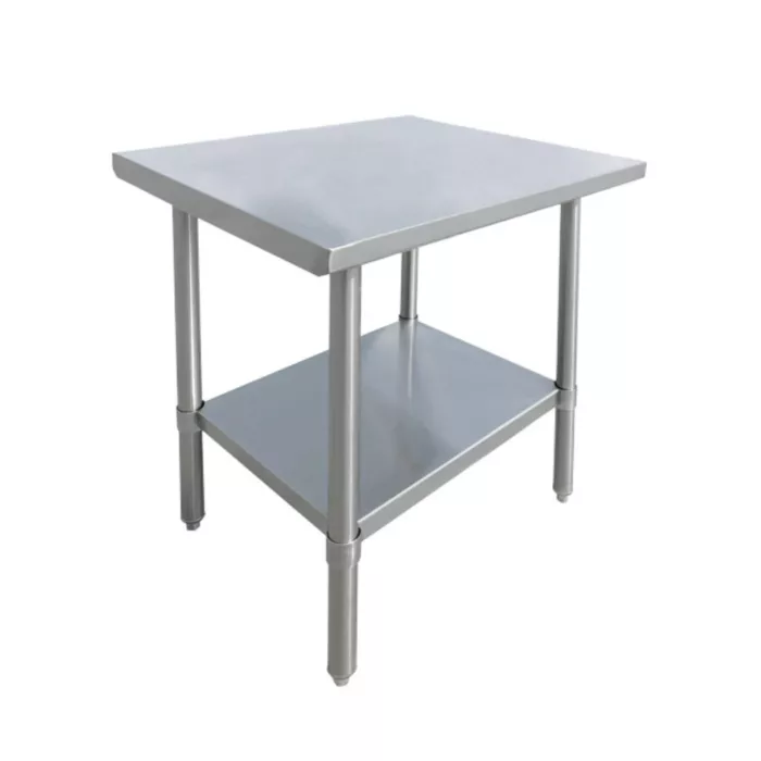 Our 24" x 24" All Stainless Steel Worktable is a durable and sturdy addition to any kitchen. Made from 20-gauge 430 stainless steel material, this worktable is built to withstand heavy equipment and frequent use, making it ideal for kitchen preparation tasks. The 20-gauge 430 stainless steel undershelf, hat channel, leg, socket, and bullet feet all add to the strength and stability of the table, allowing it to support a weight of 826.7 lbs / 375 kg. The worktable is very easy to assemble, and its smooth surface makes cleaning a breeze.