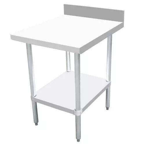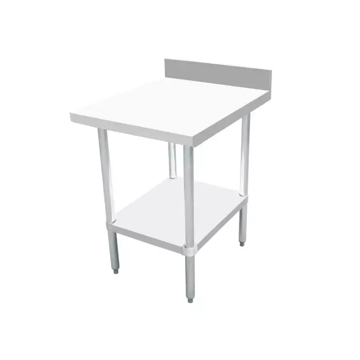 The table features a 4" backsplash to protect your walls from spills and splashes, and flat edges for a sleek, modern look. With a robust top shelf capacity of 450 lbs. (204 kg), it can accommodate a variety of kitchen appliances and supplies. The galvanized undershelf, measuring 18” x 24” (457.2 x 609.6 mm), supports up to 330 lbs. (150 kg), providing additional storage space for pots, pans, and other kitchen essentials.