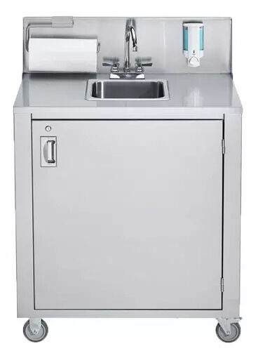 The portable hand sink is mounted on 5” plate casters, two of which have brakes, allowing for effortless mobility and stable placement wherever required. The inclusion of a 1.5” drain basket further adds to the convenience, ensuring smooth and hassle-free operation.