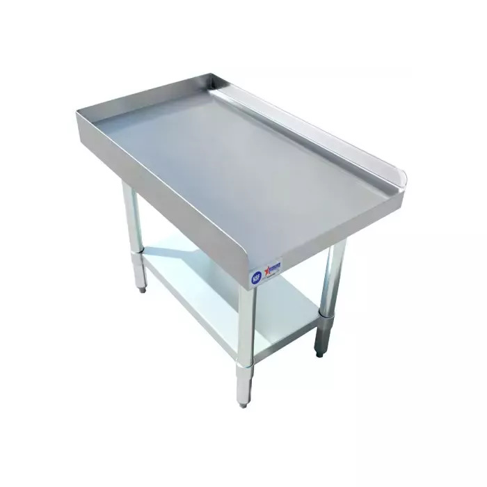 This 30” x 15" kitchen equipment stand is perfect for holding heavy countertop kitchen equipment such as mixers, grinders, slicers, griddles, and burners. Made of durable 18-gauge 430 stainless steel and 18-gauge galvanized steel undershelf, it's built to last. The galvanized legs and socket, as well as the adjustable plastic bullet feet, ensure stability and levelness on any surface.