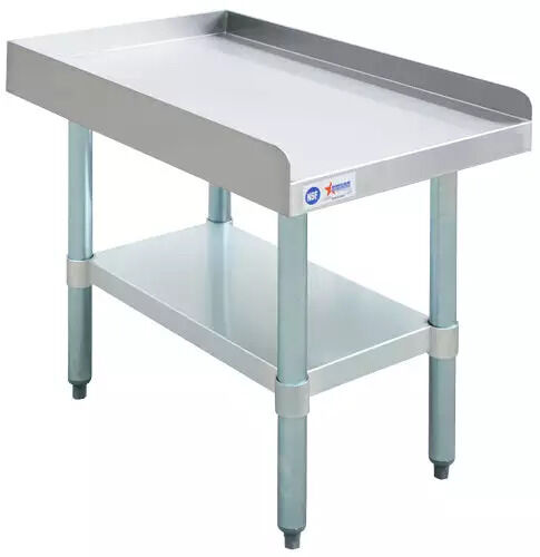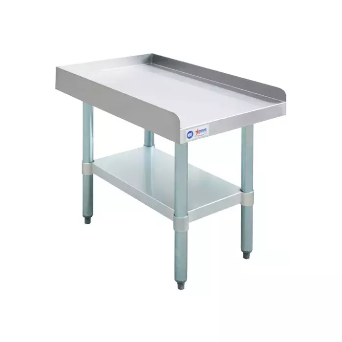 This 30” x 18" kitchen equipment stand is perfect for holding heavy countertop kitchen equipment such as mixers, grinders, slicers, griddles, and burners. Made of durable 18-gauge 430 stainless steel and 18-gauge galvanized steel undershelf, it's built to last. The galvanized legs and socket, as well as the adjustable plastic bullet feet, ensure stability and levelness on any surface.