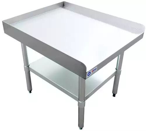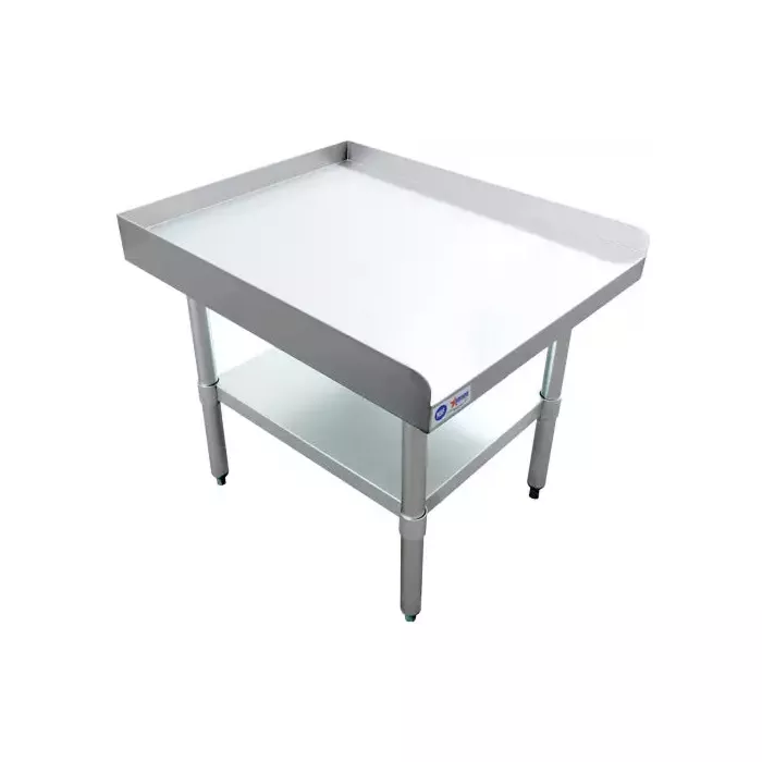 This 30” x 24" kitchen equipment stand is perfect for holding heavy countertop kitchen equipment such as mixers, grinders, slicers, griddles, and burners. Made of durable 18-gauge 430 stainless steel and 18-gauge galvanized steel undershelf, it's built to last. The galvanized legs and socket, as well as the adjustable plastic bullet feet, ensure stability and levelness on any surface.