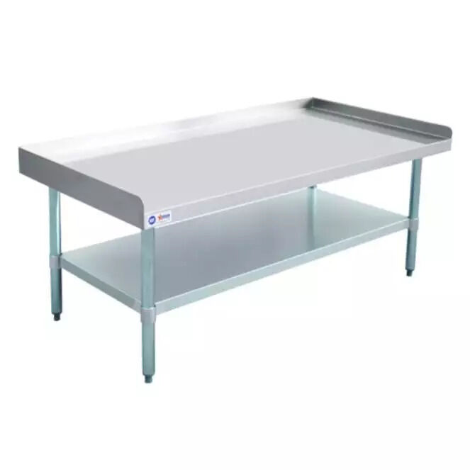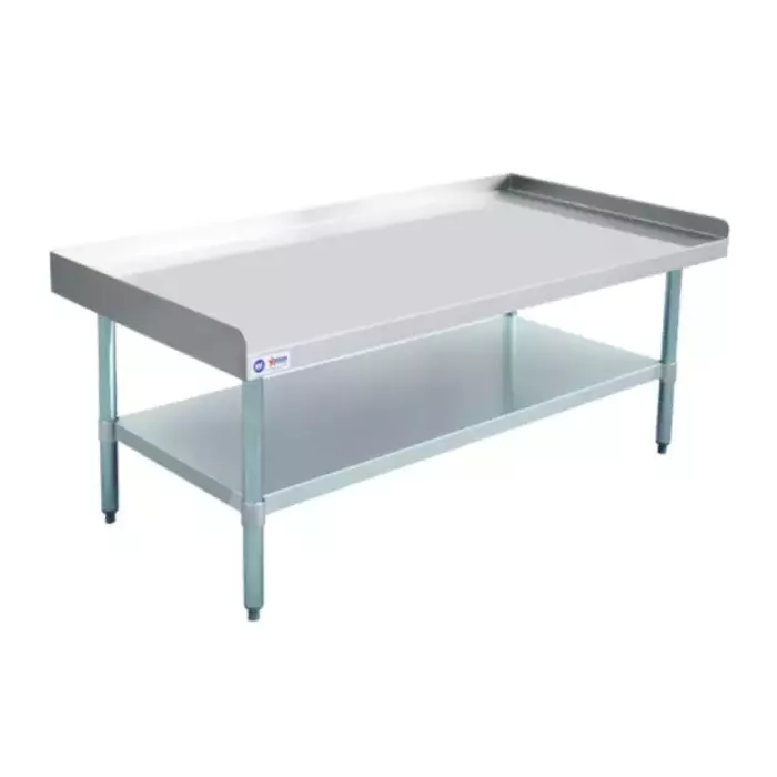 This 30” x 60" kitchen equipment stand is perfect for holding heavy countertop kitchen equipment such as mixers, grinders, slicers, griddles, and burners. Made of durable 18-gauge 430 stainless steel and 18-gauge galvanized steel undershelf, it's built to last. The galvanized legs and socket, as well as the adjustable plastic bullet feet, ensure stability and levelness on any surface.