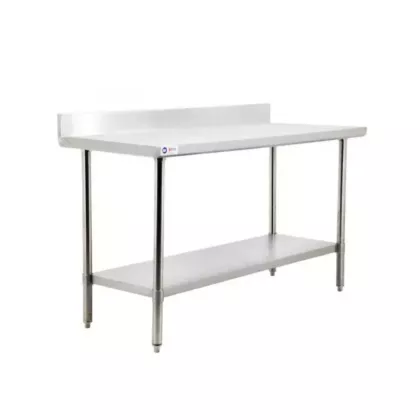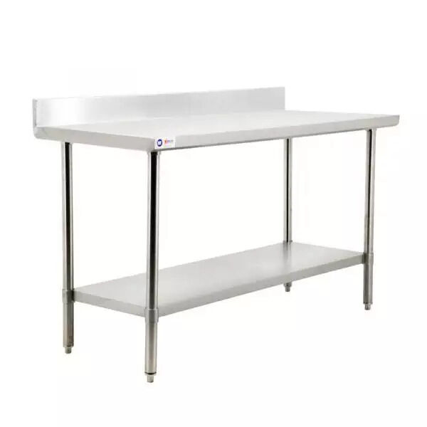 Our 30" x 96" All Stainless Steel Worktable with a 4” backsplash is a durable and sturdy addition to any kitchen. Made from 20-gauge 430 stainless steel material, this worktable is built to withstand heavy equipment and frequent use, making it ideal for kitchen preparation tasks. The 20-gauge 430 stainless steel undershelf, hat channel, leg, socket, and bullet feet all add to the strength and stability of the table, allowing it to support a weight of 1554.3 lbs / 705 kg. The worktable is very easy to assemble, and its smooth surface makes cleaning a breeze.