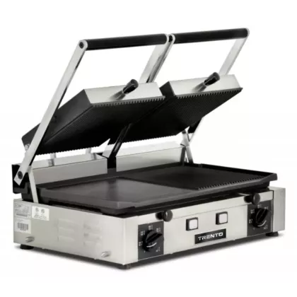 The Nella Elite Series 10" x 19" Double Panini Grill Grooved Top & Half Grooved and Smooth Bottom is the perfect grill to serve your favorite sandwiches anytime. This Sandwich Grill has a stainless steel body with cast iron grilling surfaces for easy cleaning. Ideal for sandwiches, burger, quesadillas, panini, foccacia, and pita sandwiches.