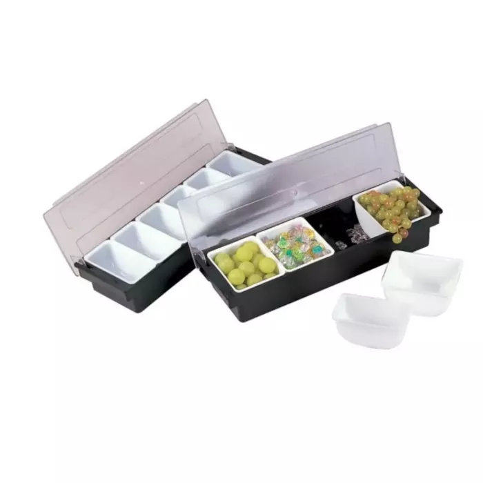 These plastic compartments feature black scratch-resistant ABS plastic material and clear polycarbonate lid cover. Units available with three, four, five, and six compartments.