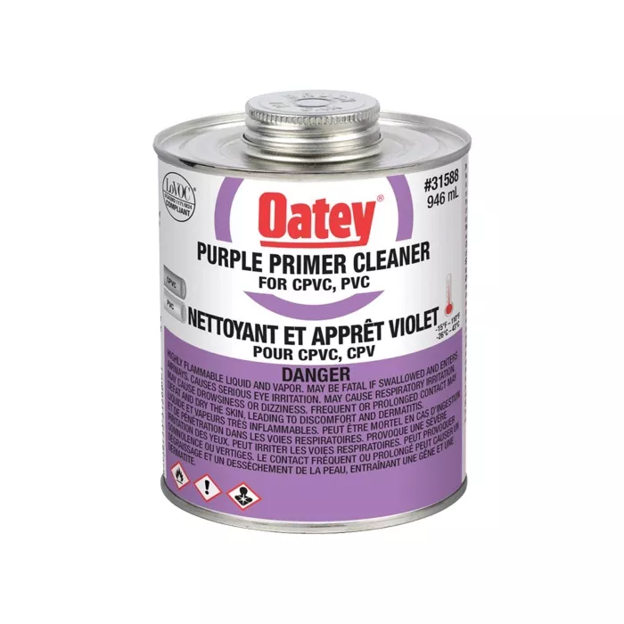 - Purple-tinted all purpose primer/cleaner for PVC and CPVC pipe and fittings