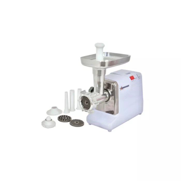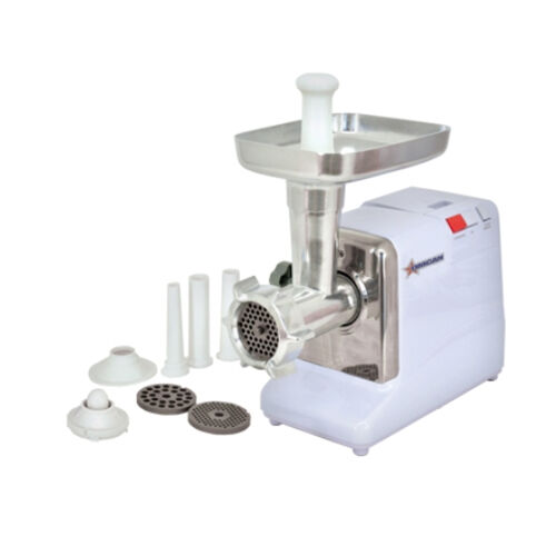 Make your own traditional sausages, meatloaf, meat sauce, chilli, hamburger and kubbe from the comfort of your own kitchen. This grinder features a heavy duty aluminum grinder head, a forward and reverse switch to prevent jamming, heavy-duty aluminum auger to ensure even flow of product and long life for grinding assembly, durable die-cast meat tray, and three stainless steel plates - fine, medium, and coarse. There is a built-in circuit breaker to prevent overheating of the motor.