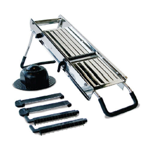 Slicer is 18/10 stainless steel. Unit comes complete with five interchangeable cutting blades and a plastic hand pusher. Handles and feet are coated with rubber, which provides stability during use. Top levers allow thickness adjustments to 1/2". Designed to slice, waffle, and julienne cut a variety of fruits and vegetables.
