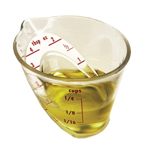 1/4 cup/60 ml. Patented angled surface lets you read measurements from above. Measures small amounts of liquids without spilling. Cup, tablespoon, ounce and milliliter measurement markings. BPA free. Dishwasher safe.
