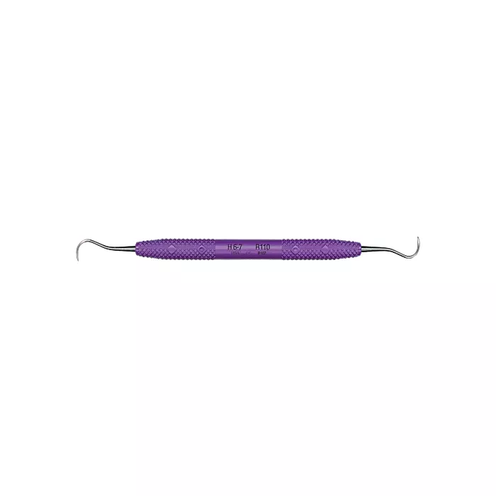 Double ended sickle scaler for use in the anterior, interproximal and premolar areas of the mouth. PDT instruments are ideally weighted, featuring the most ergonomic handle with knurling to the instrument shank to provide increased comfort with less hand fatigue and pinch. PDT's focus on ergonomics greatly reduces the development of musculoskeletal disorders.