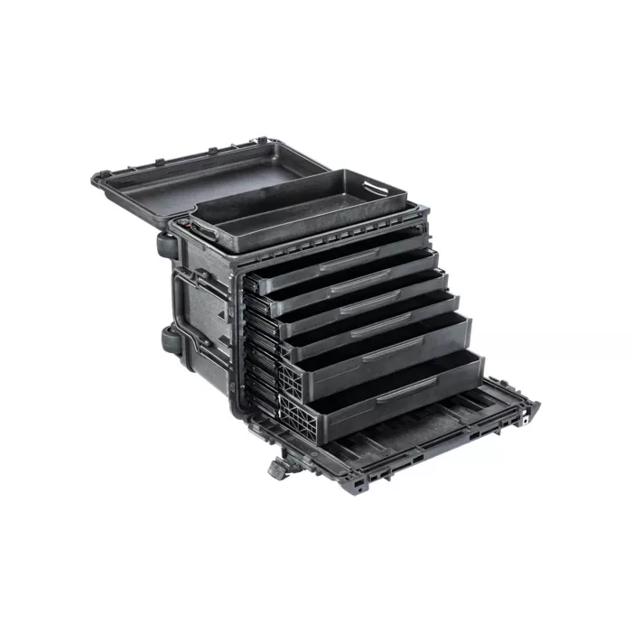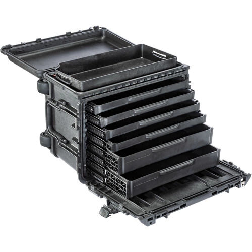- Features an extended length trolley handle, removable drawers, and aluminum rail slide system and heavy-duty buttress hinges