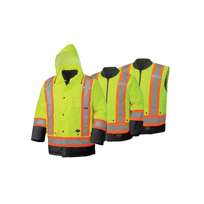 - Features a quilted lining, detachable snap hood, 2 large front cargo pockets, 2 inner pockets, full front zipper with snap storm placket, 7" side zippers for greater mobility, storm cuffs, detachable sleeves
