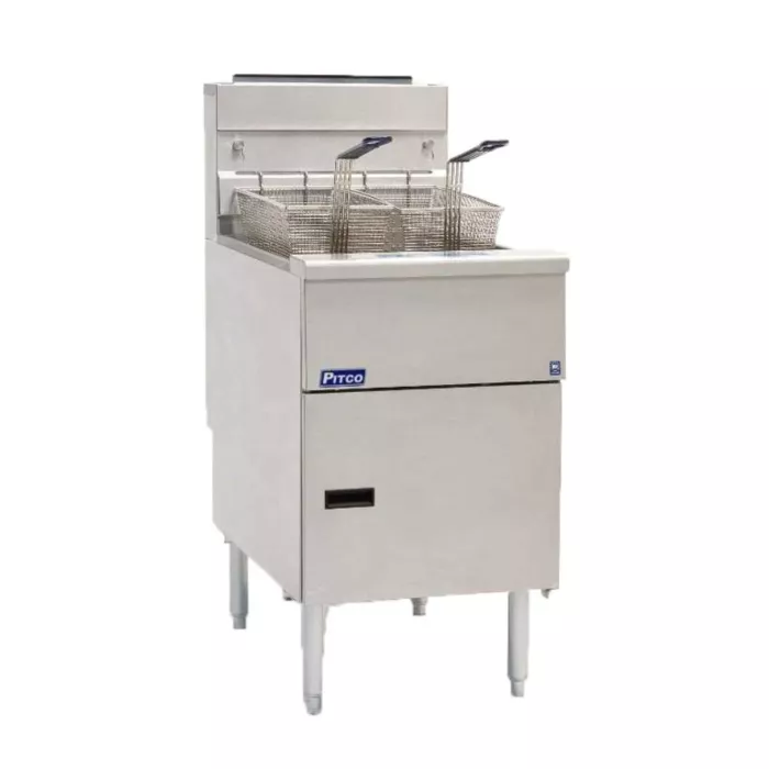 This High Production Pitco SG18S Solstice natural gas single economy commercial fryer is built with Pitco's patented Solstice Burner Technology. The dependable blower-free atmospheric heating system provides fast recovery to cook a variety of food products. The Solstice gas fryer comes standard with a millivolt thermostat with a thermo-safety pilot, and a high-temperature safety limit switch. The unique Solstice burner and baffle design increases cooking production lowers flue temperature and improves the working environment compared to previous models.