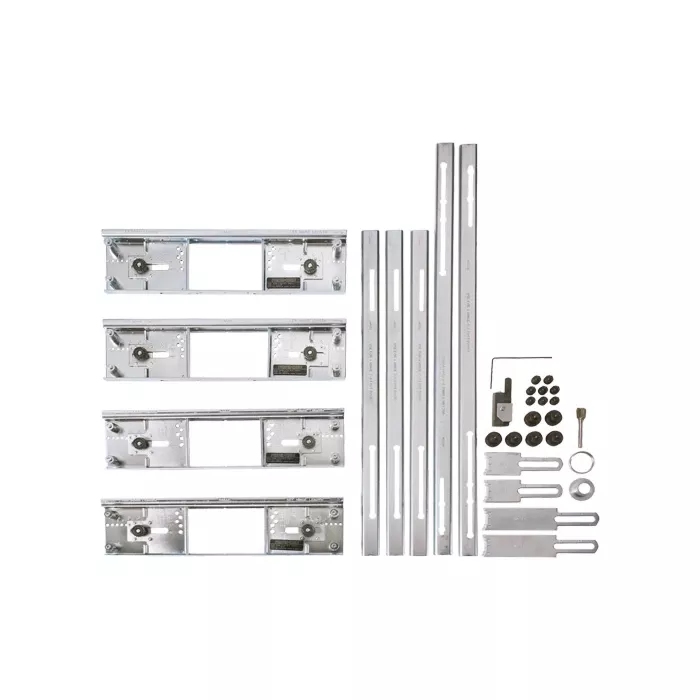 - Includes: (4) Metal hinge templates, (3) Short steel rails, (2) Long steel rails, (1) Carbide-tipped router bit, (1) Template guide, (1) Lock nut, (1) Corner chisel, (2) Pairs of end gauges, (8) Small thumb screws, (6) Large thumb screws, (1) Hex key, (1) Instruction sheet, (1) Carrying case