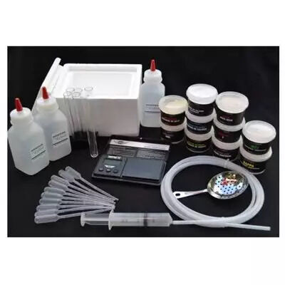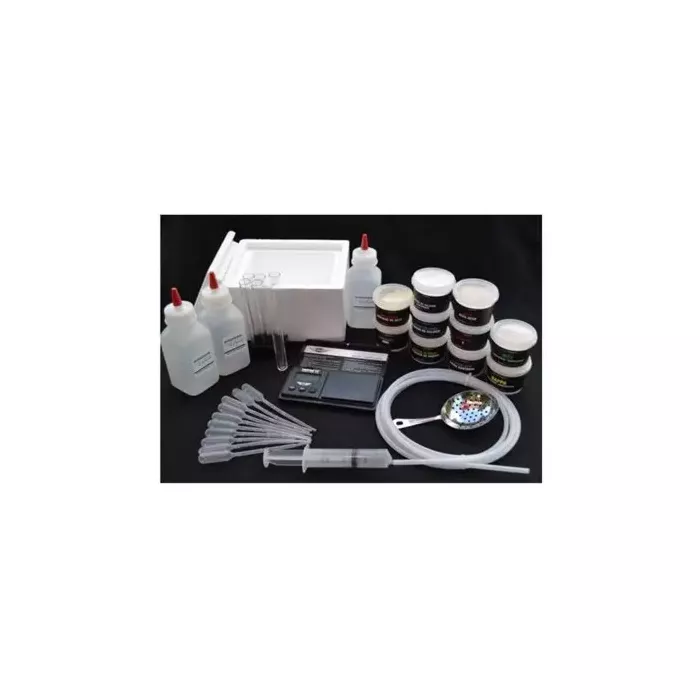 Agar 60 g ,Xanthan 70 g, ultra tex 8 50 g, Versawhip 50 g, Soy lecithin 50 g, Sodium alginate 60 g, Calcium chloride 90 g, Iota carrageenan 70 g, Kappa carrageenan 50 g, Calcium lactate gluconate 65 g