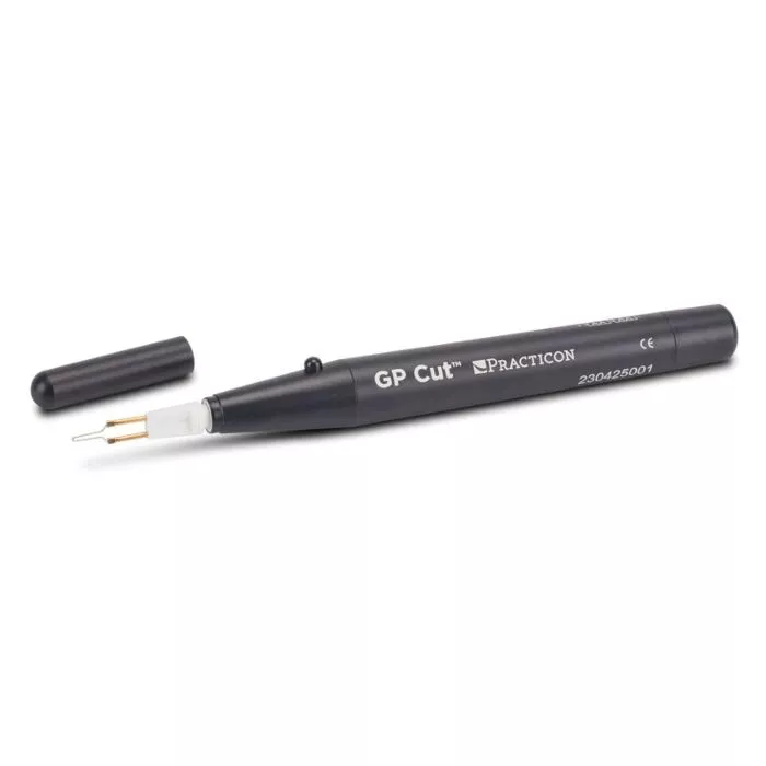 Cut gutta percha quickly, cleanly, and safely within the pulp chamber with the cordless GP Cut Gutta Percha Cutter. Hold the power button for one second and the tip will reach up to 1,832°F (1,000°C). Release the button, and the tip cools down in less than one second. Bendable, flexible tips come in three straight sizes: large (2.0mm wide), medium (1.2mm wide), and small (0.5mm wide). Also available in angled small (AS) size for improved access.