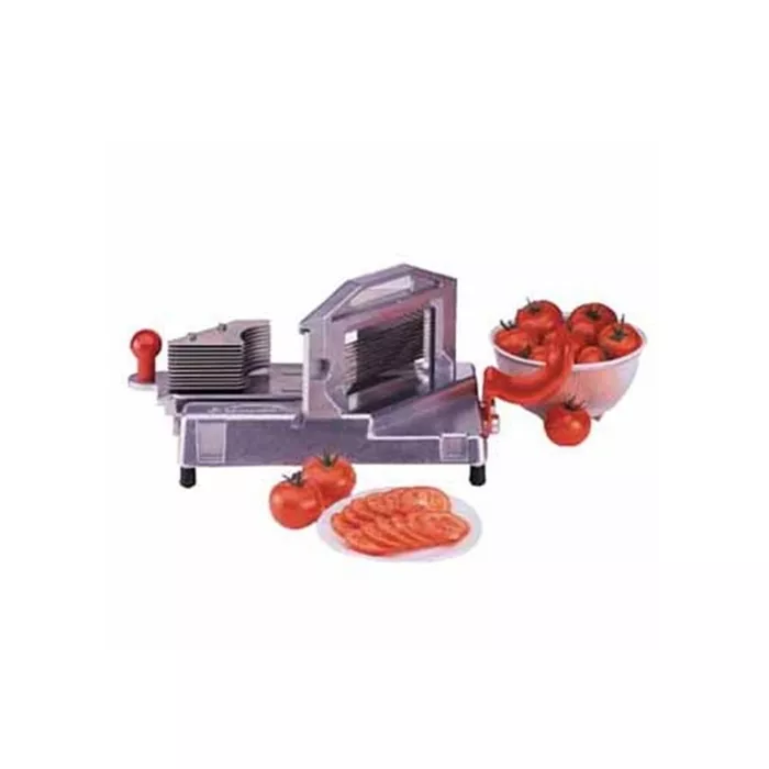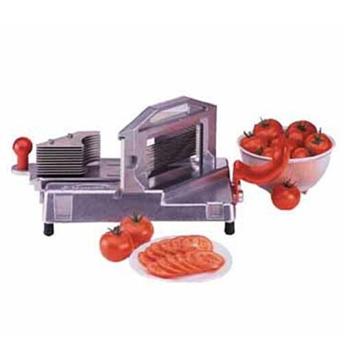 Perfect slicing every time. Perma-Tight blade cartridge system never needs adjustment. Ergonomically-designed contoured pusher handle carries tomato through blades instead of rolling it. Commercial-grade aluminum cast base for added strength, weight and corrosion-resistance. Permanently lubricated Duralon bearings allow pusher and carrier assembly to effortlessly slide along polished stainless steel rods.