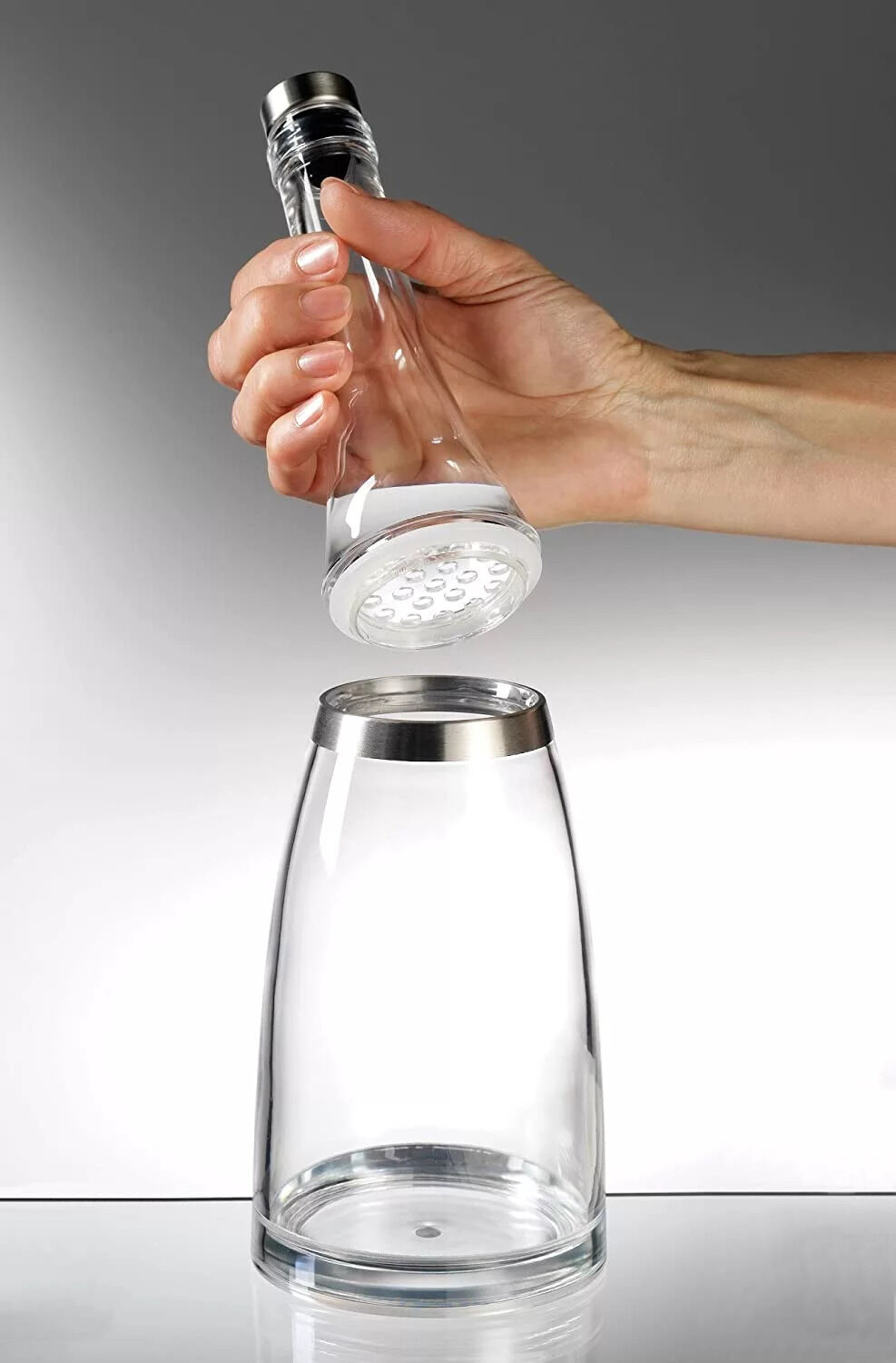 Infuse water, tea, spirits and more with wonderful natural fruit flavors. Tall and good looking, the Flavor Bottle will add utility to any kitchen or home bar. Twist neck to remove and fill with beverage and sliced fruit. Shake it up with ice for faster infusion or great martinis. Refill beverage after each use by adding more through the top opening. No need to remove neck to refill. Fits on refrigerator door shelf 32 oz. (950 mL) body, (36 oz. filled to top).