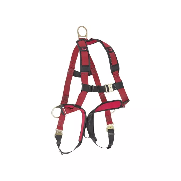 - Vest style harness with integrated cushion on back, shoulders and leg straps, with 5 adjustment and 3 connection points