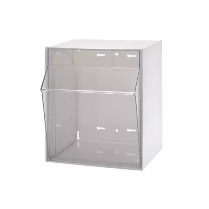 - Clear tip out bin consists of break-resistant injection-molded plastic containers that can store small to medium items