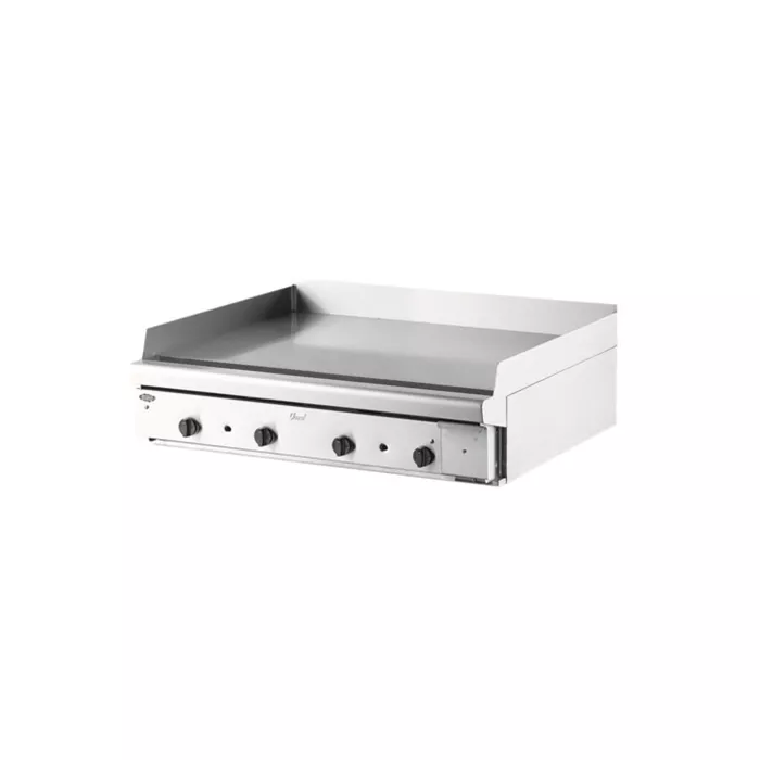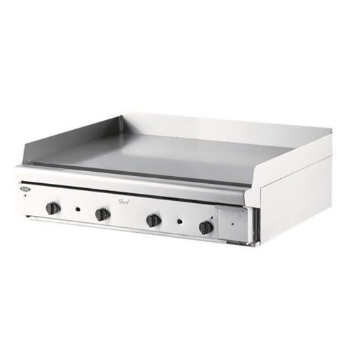 Dimensions: 24" W x 8-1/2" H x 33" D Fuel: Natural gas 60,000 BTU Modular Smooth griddle, 5/8" thick mild steel plate Manual control (3) independent cooking zones Back & side splash guards Grease trough Stainless steel front & sides NSF, CSA Star, CSA Flame Image of 36" version. Actual product 24" W and has (3) knobs.