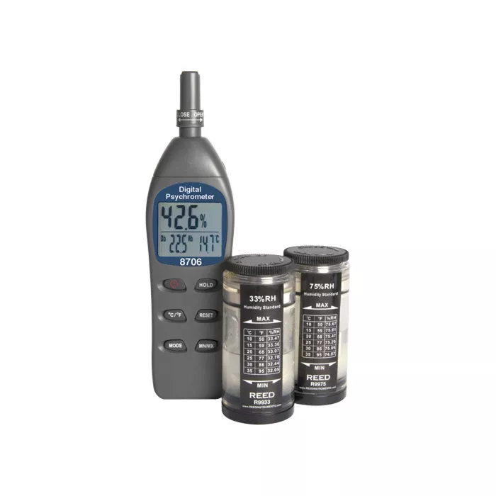 - Includes: Digital Psychrometer, Set of 33% and 75% Humidity Calibration Standards