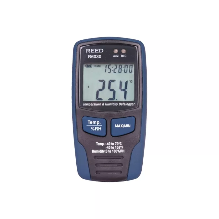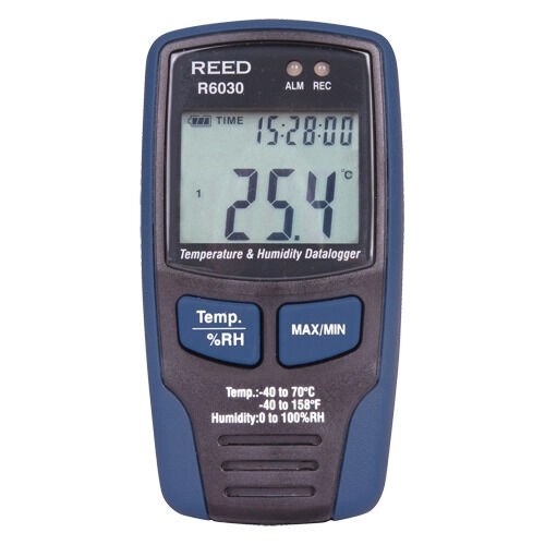 - Records up to 32 700 ambient temperature and relative humidity readings