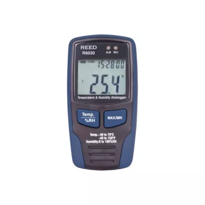 - LCD readout displays current temperature (°F or °C) or humidity reading, min/max reading with date and time