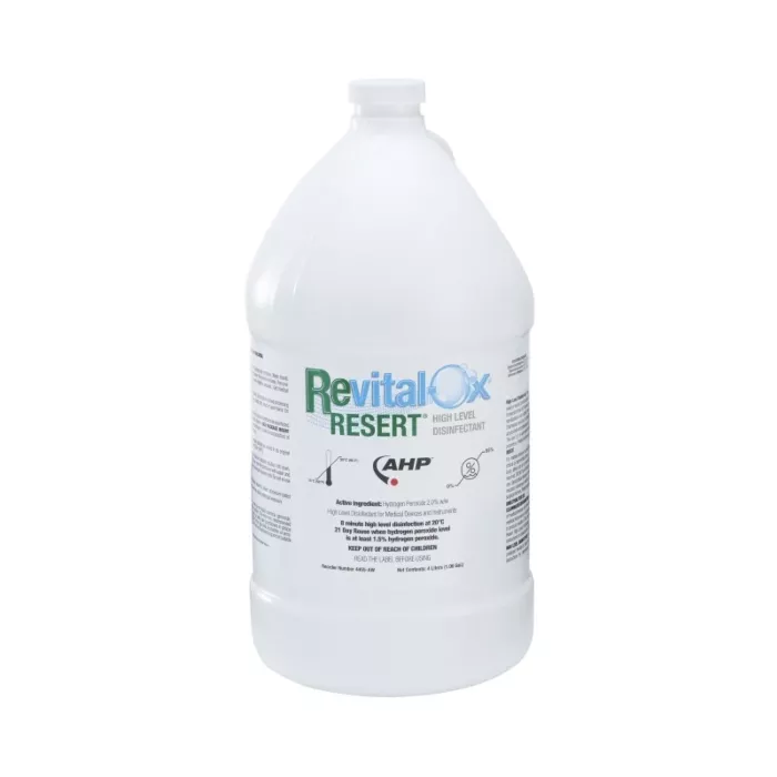 Revital-Ox RESERT High Level Disinfectant (HLD) is a high level disinfectant when used or reused undiluted for a maximum of 21 days at a minimum temperature of 20°C (68°F) for a minimum immersion time of 8 minutes. This high level disinfection solution is a ready-to-use option for devices for which alternative methods of terminal processing, including aldehyde [glutaraldehyde and ortho-phthalaldehyde (OPA)] solutions, are not suitable or available.