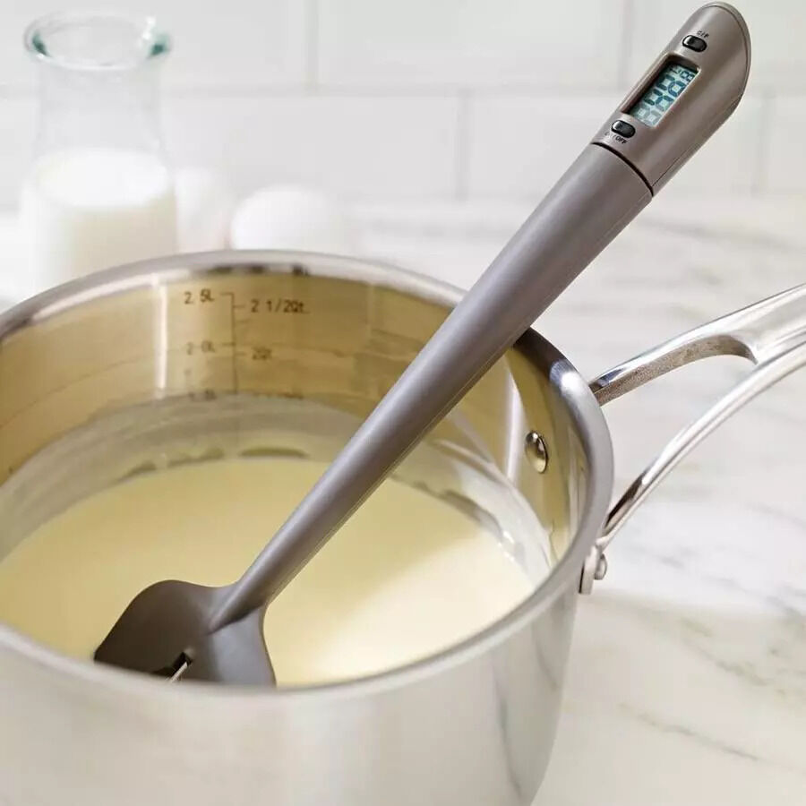 This spatula with an integrated thermometer can both be used to stir and to measure precise temperatures for preparations such as caramel or jams. Once the tip is removed, it becomes a thermometer for cakes and meats.