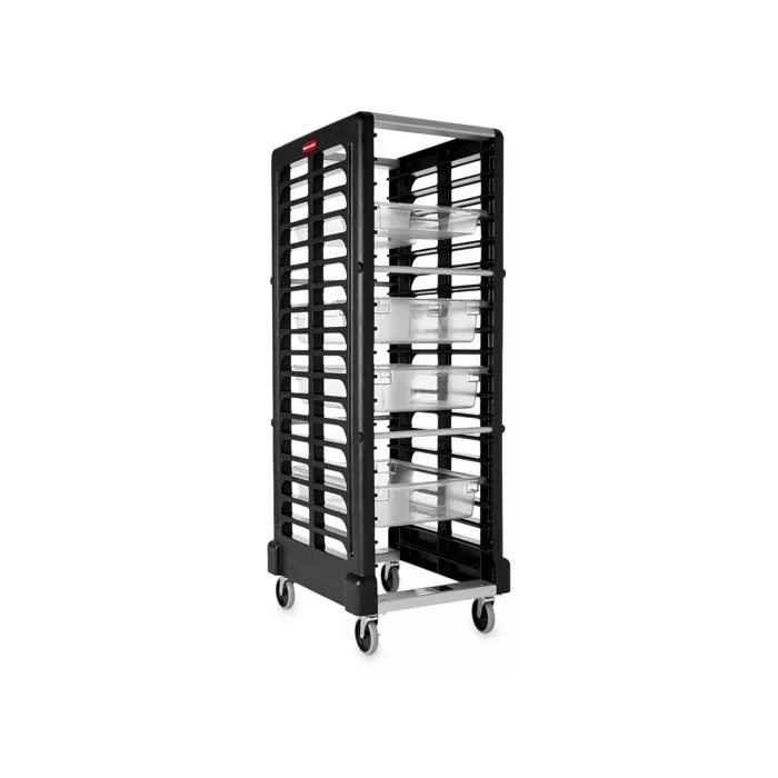 - Versatile system specially designed to fit up to 18 food boxes and sheet pans