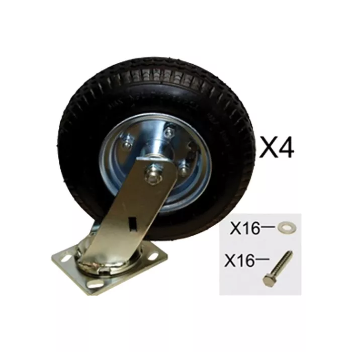 - Includes: (2) 8" x 2" pneumatic swivel casters, (2) 8" x 2" pneumatic rigid casters, (16) 3/8"-11 x 2.5" lag screws, (16) 0.375" type A narrow washers