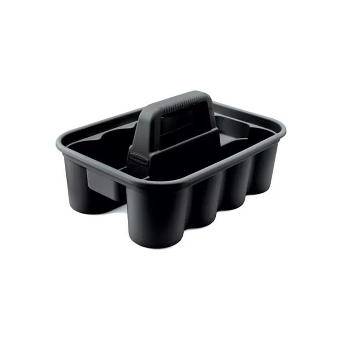 Heavy-duty caddy conveniently fits on cleaning and housekeeping carts. Securely holds up to eight 32 oz spray bottles and other common cleaning tools. Ergonomic handle design provides comfortable fit.